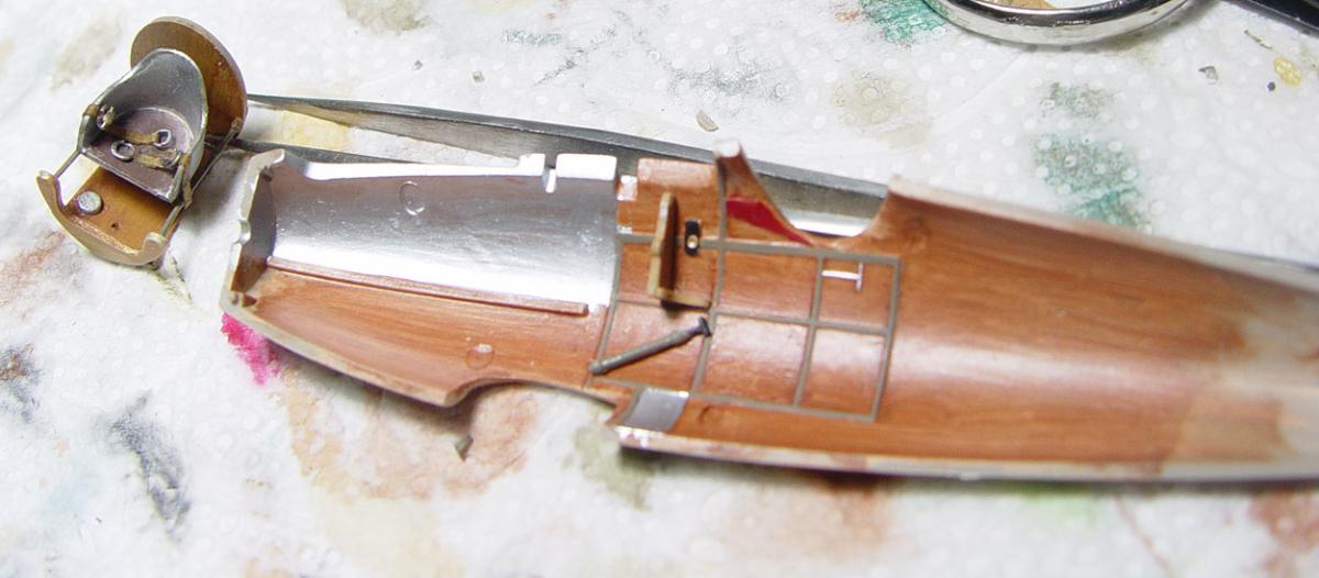 Construction started with the cockpit. I added a couple of seat belt, that i made with some Tamiya tale and some lead wire. Not very accurate, but they greatly improve the look of the cockpit. Then i turned my attention to the side walls, painting the wood grain with my usual method: first a coat of lighter brown (acrylics), and then thinned oils handbrushed and hand-brushed...