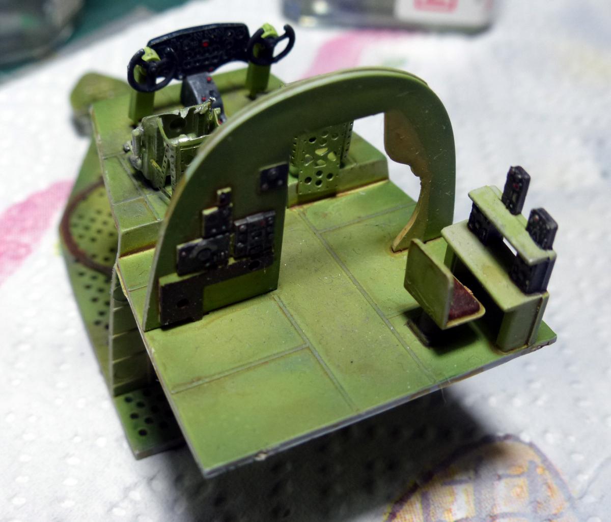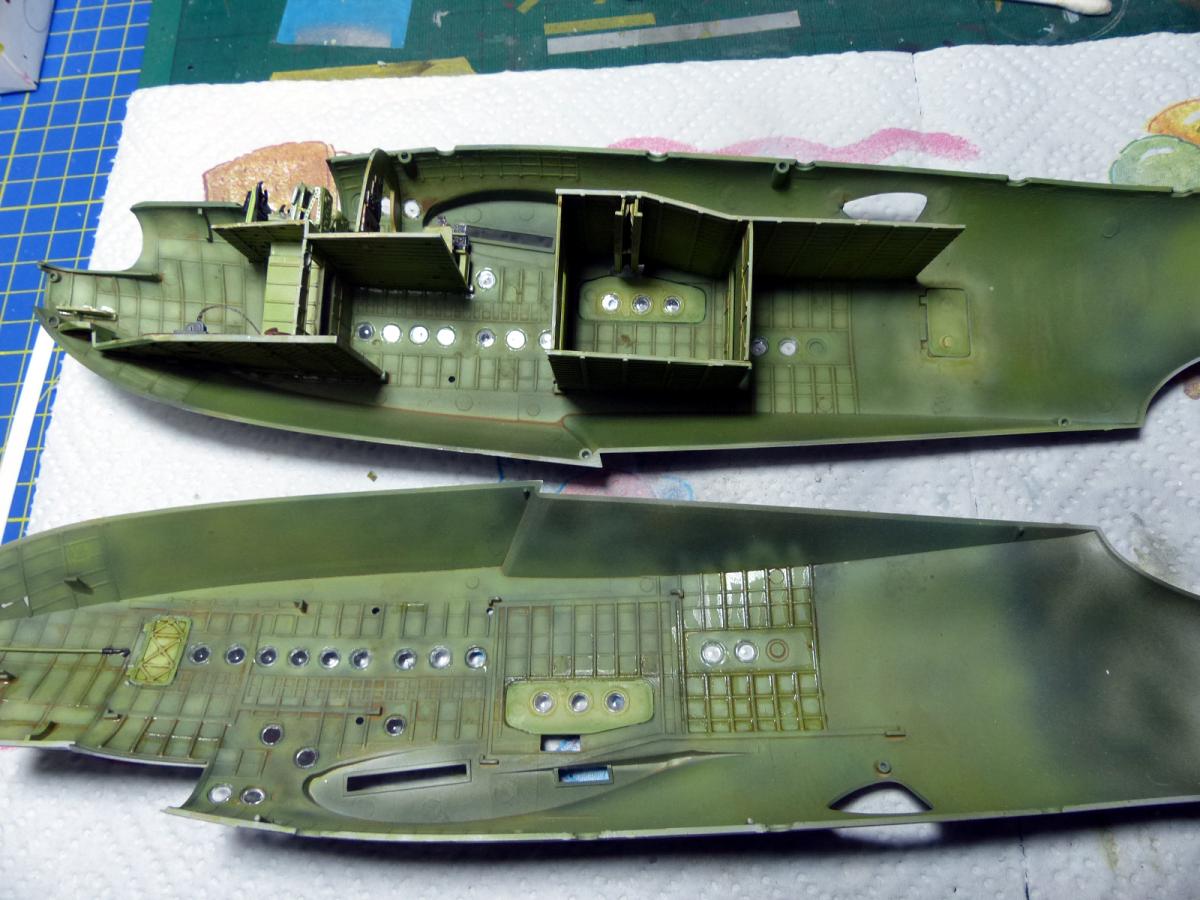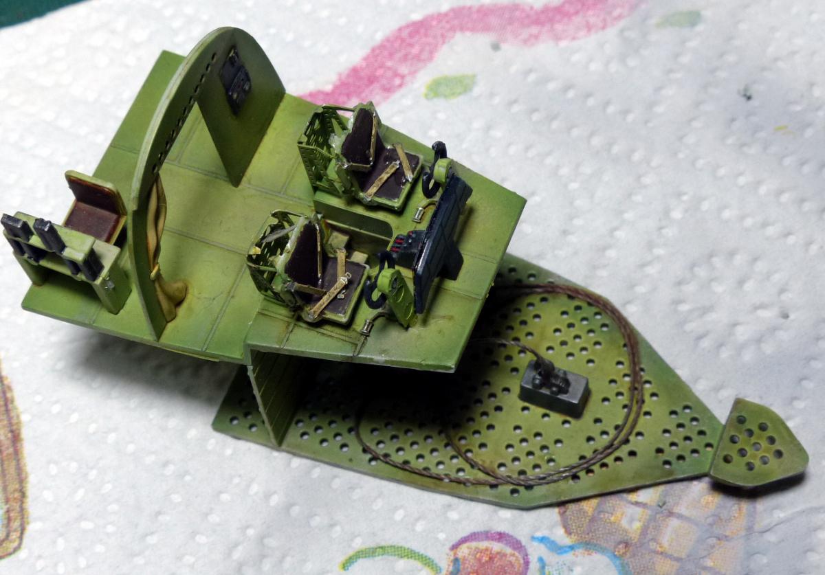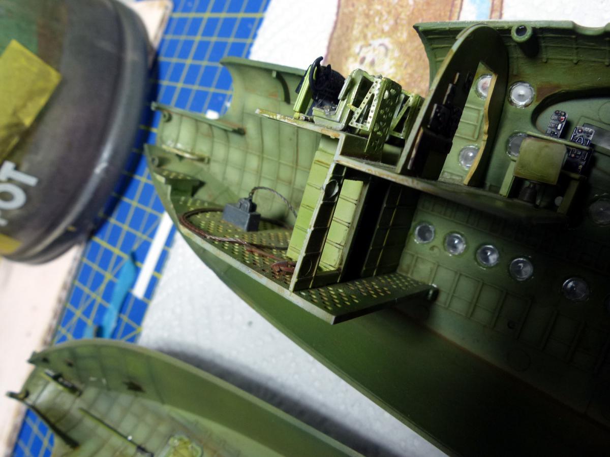 Construction start with the cockpit and the interiors: in the box you find enough materials to build some nice interiors, but of course there is a lot of space for the fans of the scratch-building. To replicate the UK interiori green i made my own mix of Vallejo AirColor (Vallejo Camo Light Green 71109, 3 part, + Vallejo White, 1 part), adding some post-shading, and some oil washes of different colors (mostly black/brown, plus some rust around the anchor).