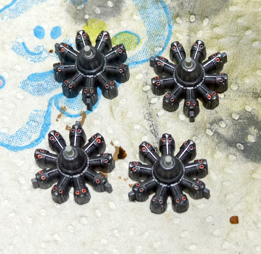 Then i painted the interior of the turret and masked them, to install them later. I assembled the attachment for the bombs, and then i worked on the engines: i did some small scratchbuilding, adding some copper rods, and then painted everything with metallic buffable colors (Model Master) in various shades, completing everything with a dark wash.