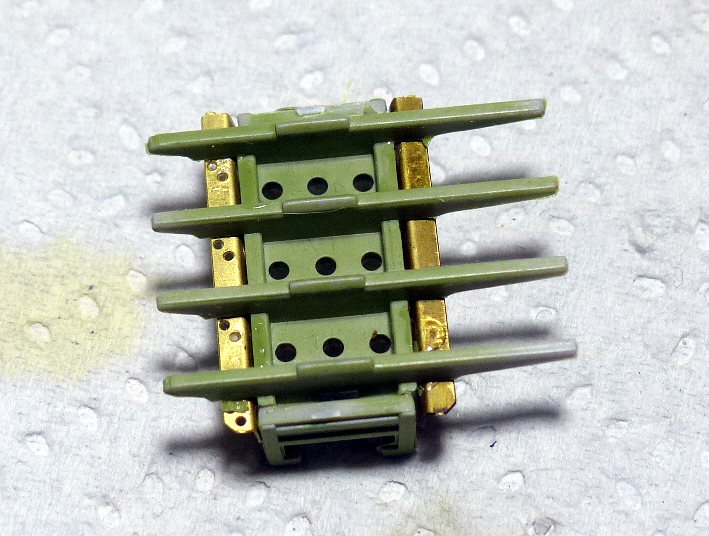 The green was made with Vallejo Aircolor 71006 Camo Light Green (2 parts) + Vallejo Aircolor Green Zinc Chrome (1 part) followed again by hairspray.