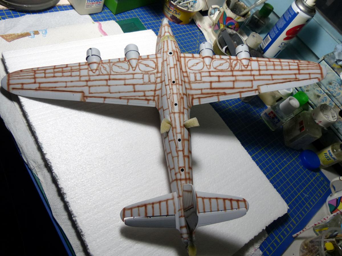 The next step was dedicated to the preliminaries to the painting. Since i was going to use the hairspray technique, first i primed the model with Vallejo gray primer, then i pre-shaed it in rust color, then i airbrushed a Vallejo Aircolor alumium inside the panels and only slightly on the pre-shaded panel lines, to tone them down a little . This allows to retain the pre-shading and have a nice base for the following steps of hairspray.