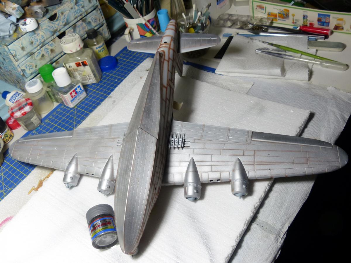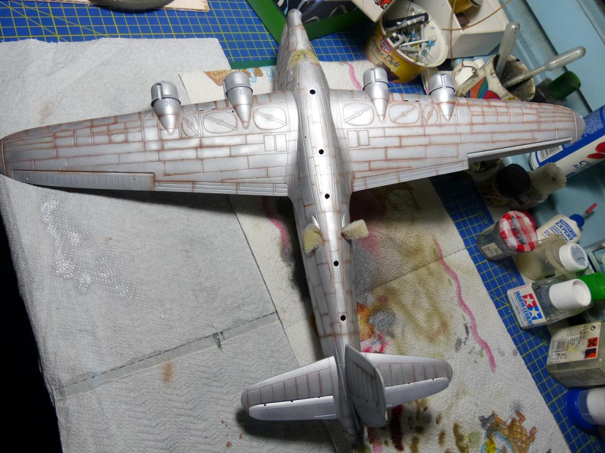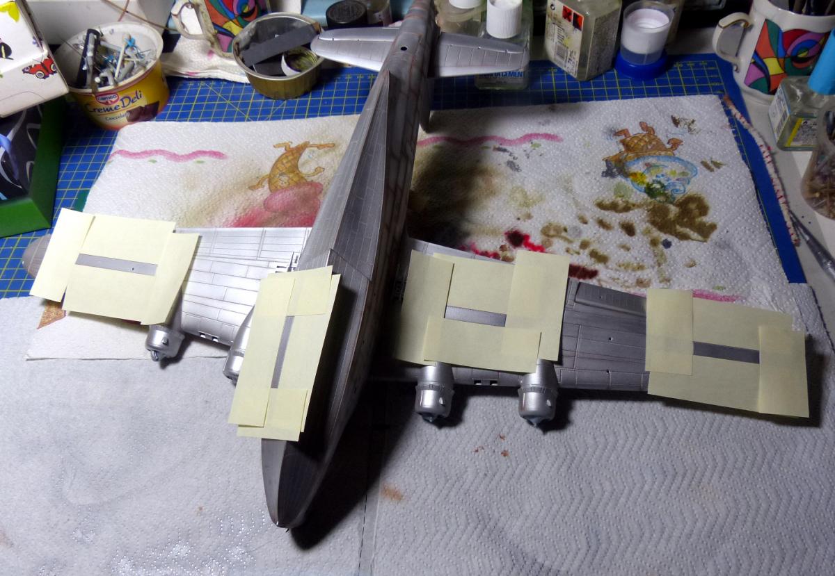 The next step was to paint the lower fuselage and lower side of the wings in MetalMaster buffable allumium color, followed by some masking with Post-it to change the color of some panels.