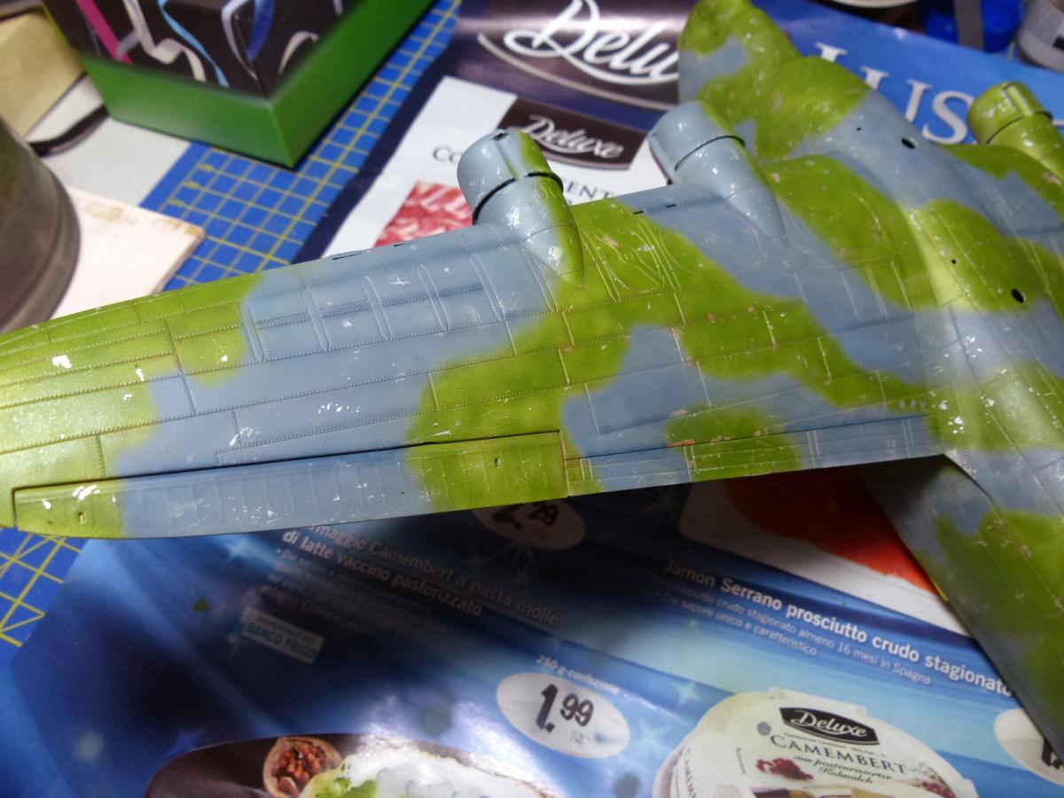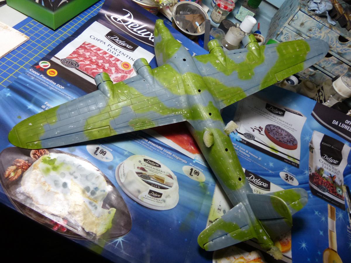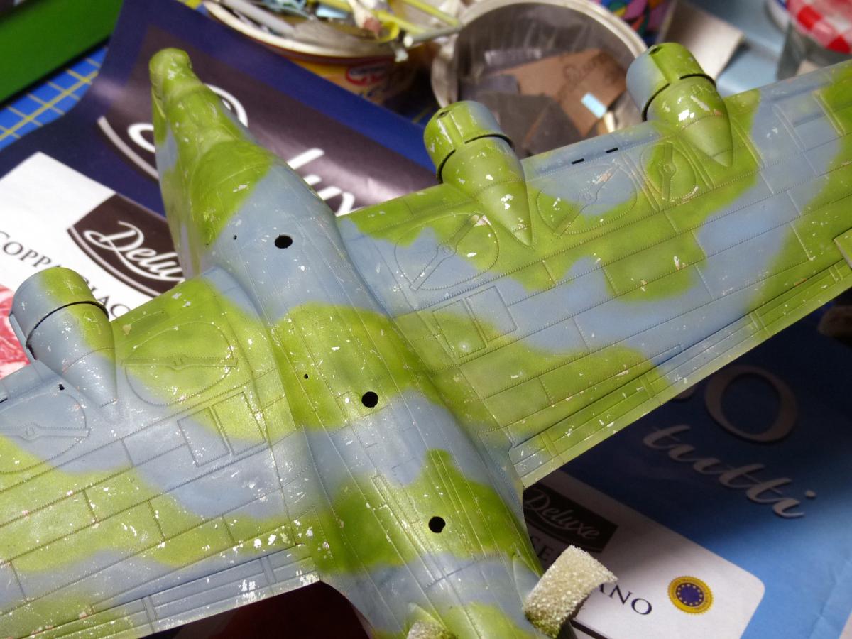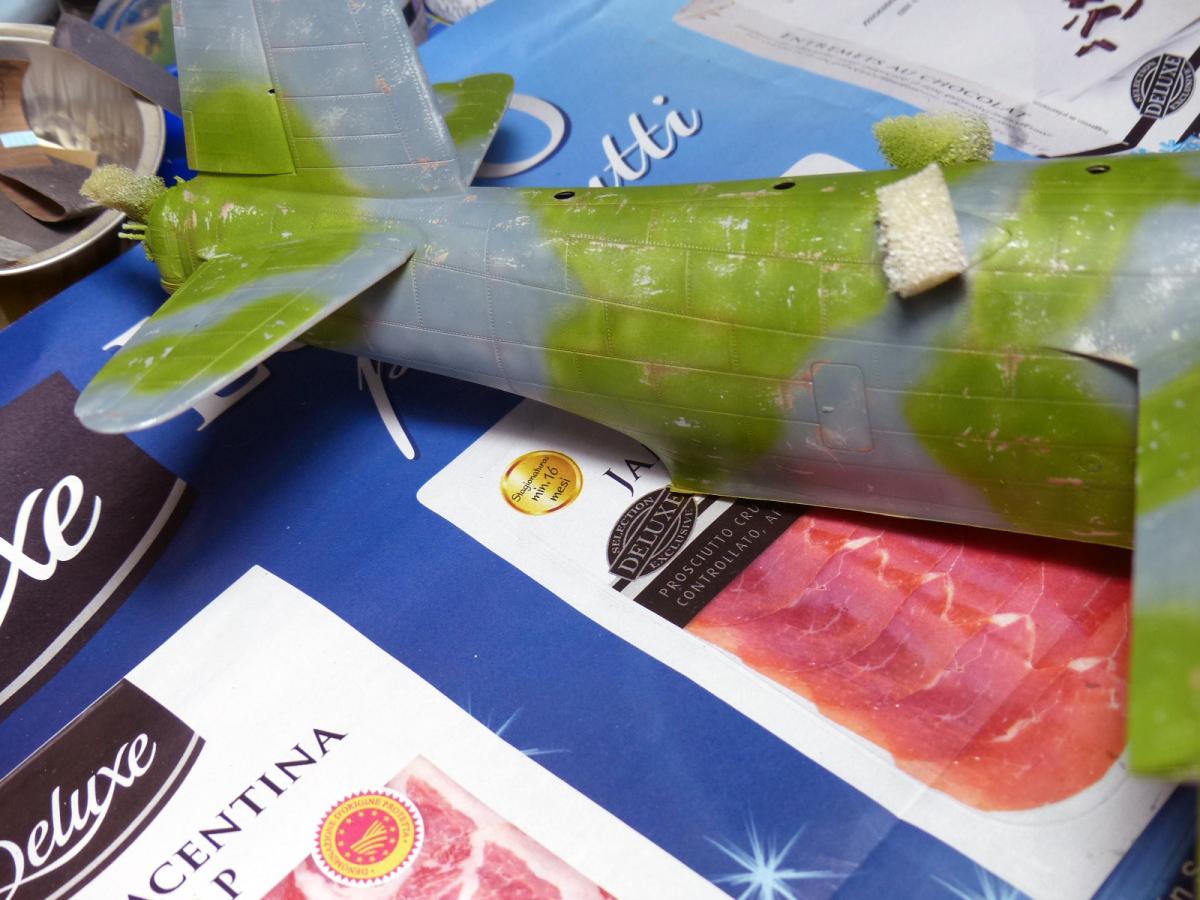 It was time to airbrush the two main colors. First the gray/blue, made with Vallejo Aircolor 71109 UK PR Blue (2 parts) + Vallejo aircolor 71054 Dark Grey Blue (1 part), airbrushed and followed by hairspray (after many tests with dedicated products, like the AK or the Vallejo chipping fluid, i still consider the old, cheap real hairspray the best medium to achieve this effects).