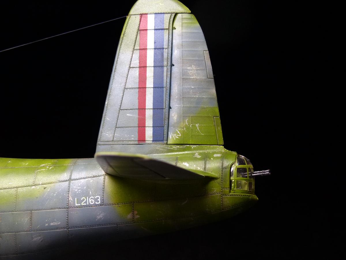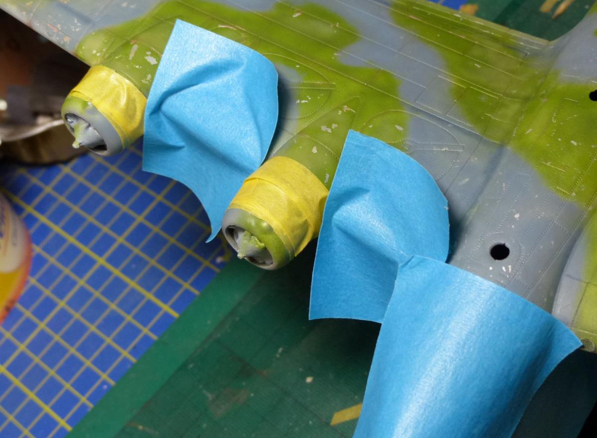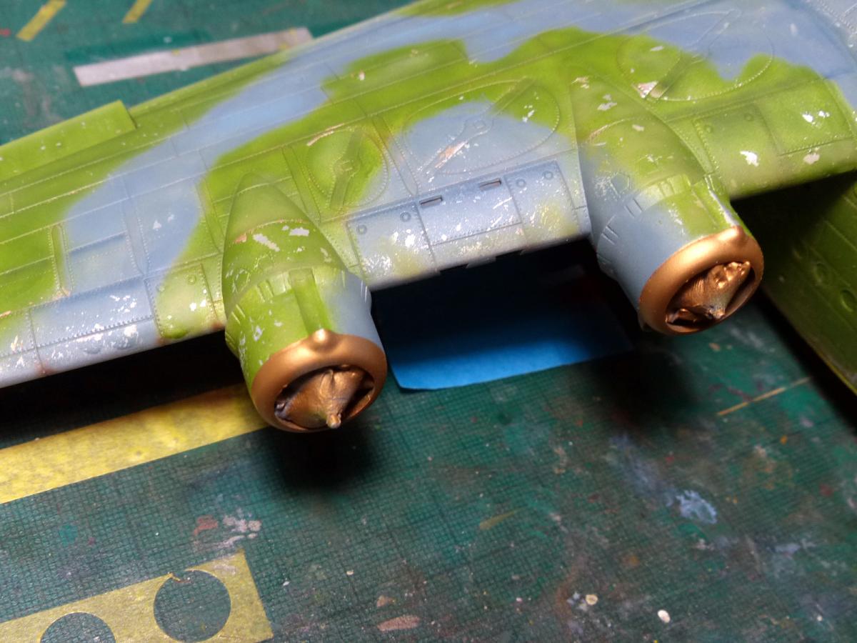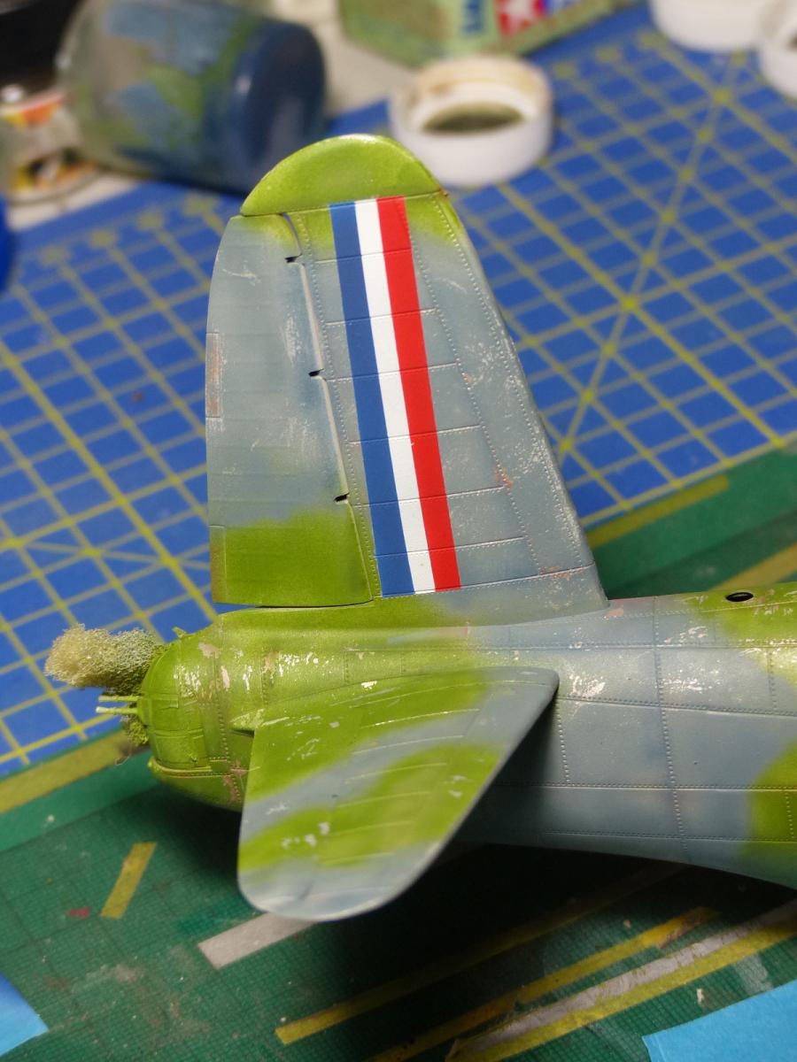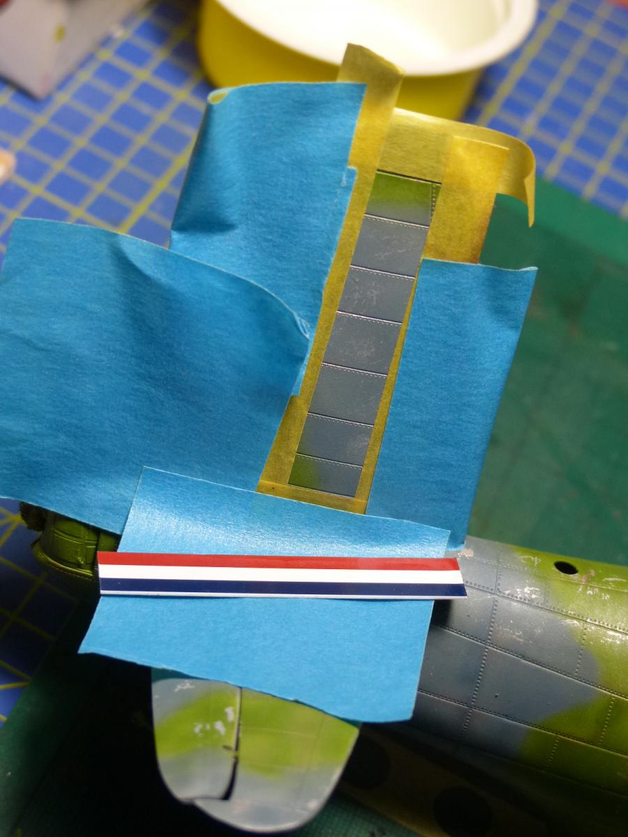 With the main painting job completed, i turned my attention to other details: the copper-color on the front engine cowling, and the tricolor insignia on the tail (I didn't want to use the provided decals for it, so i used it only as template for the mask).