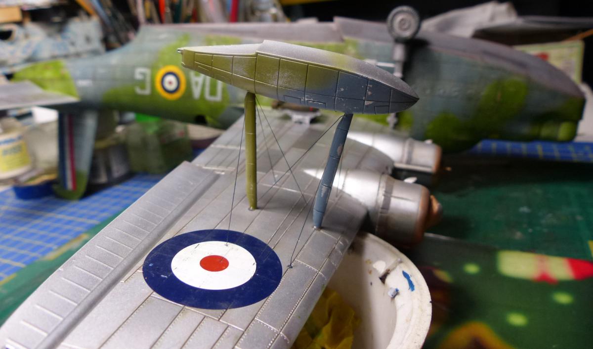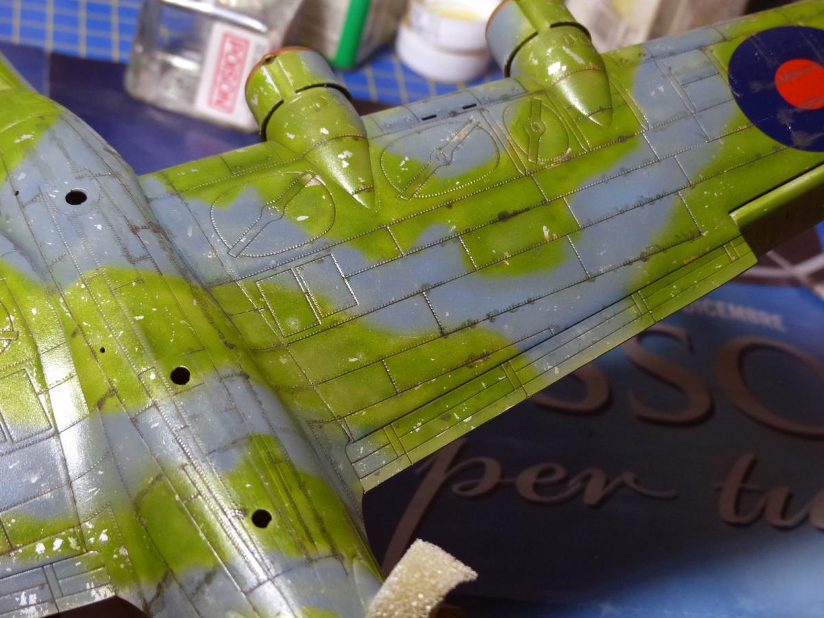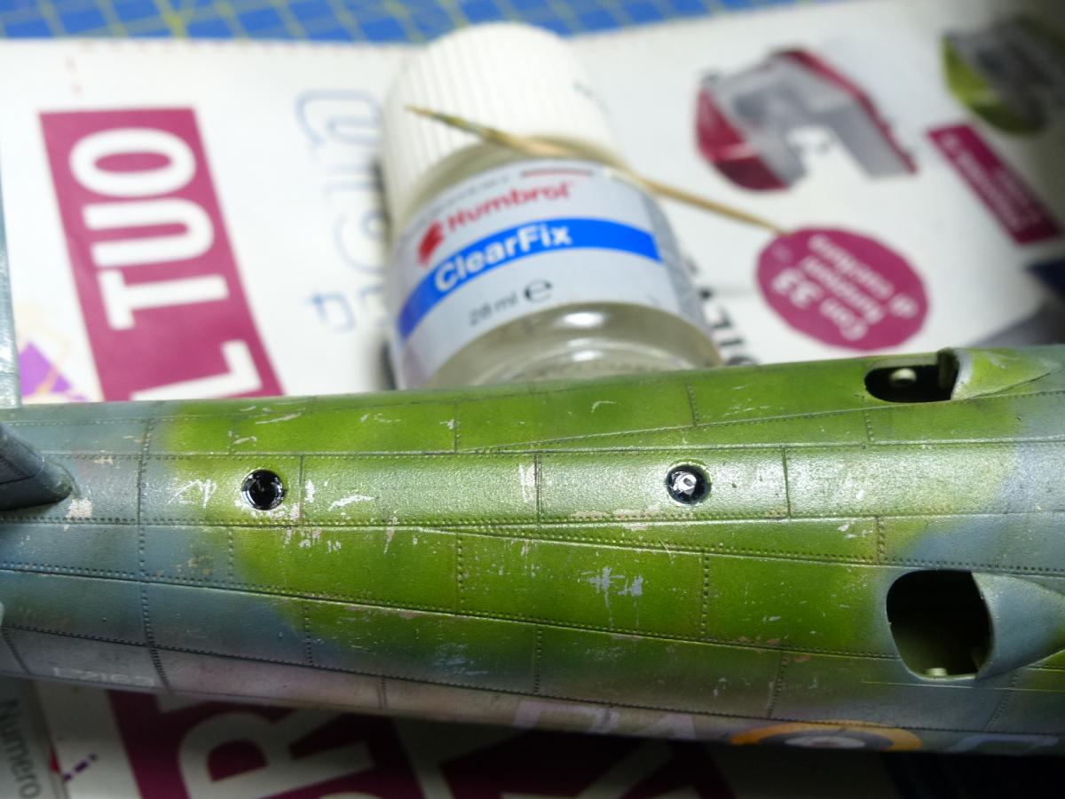 With the weathering completed i turned my attention to the small windows on the top fuselage: indeed, when i closed the fuselage, i left them open, because i didn't trusted in the way suggested by Italieri to assemble them (glue each one on half the fuselage, and then gluing the fuselage parts). To make the small windows i used Humbrol Cristal Clear glue: it worked well, BUT... only for the first 3 ... going ahed, when they dried, i discovered some air bubbles inside the last windows. So , lesson learned: for each window use a clean different toothpick.