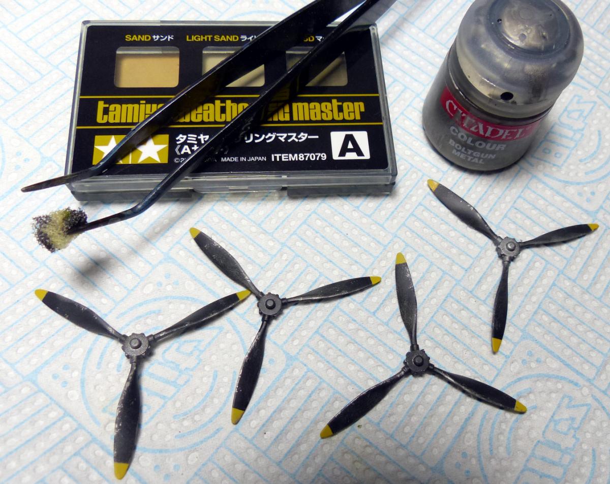 To complete the model i glued the floats and rigged them; i assembled, painted and weathered the small cart provided with the kit (i used the sponge method for the chippings); and painted and weathered the propellers (again with the sponge, and adding some Tamiya pigments).