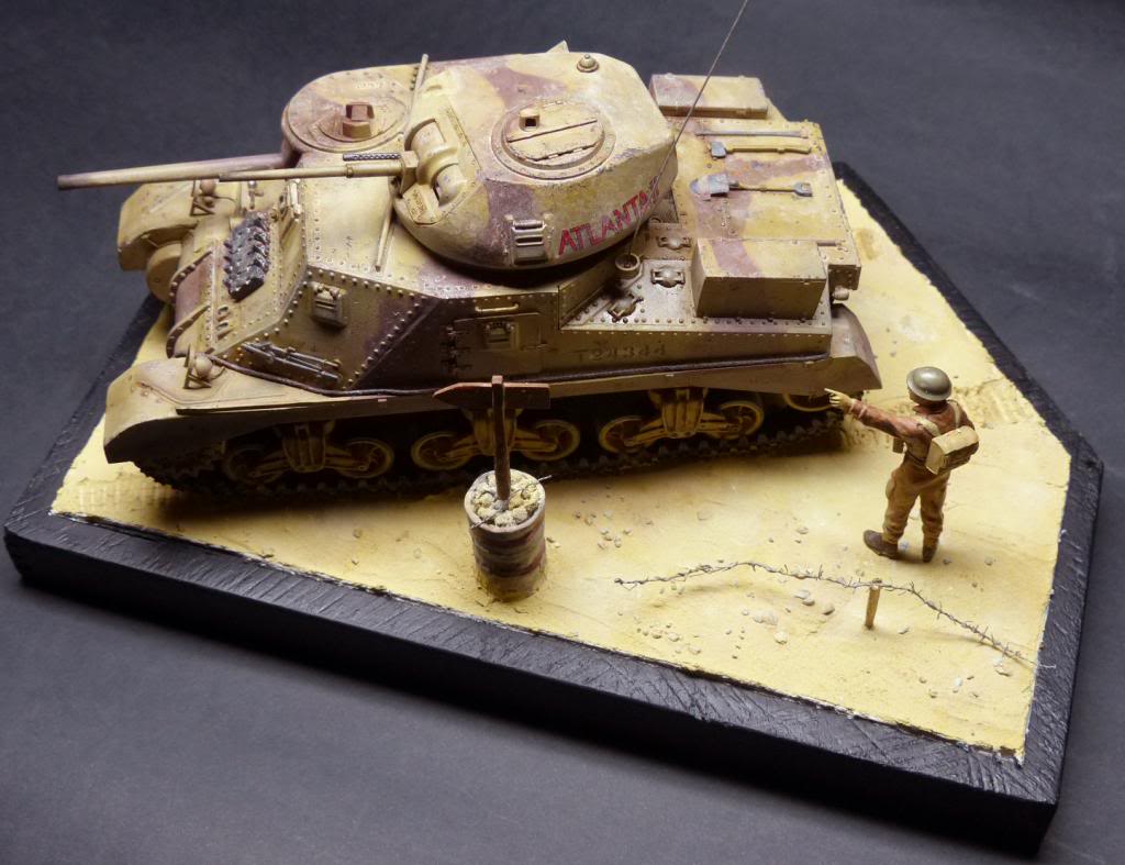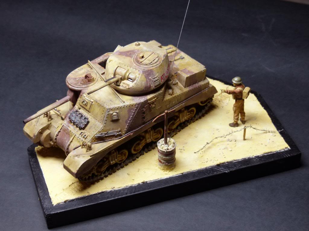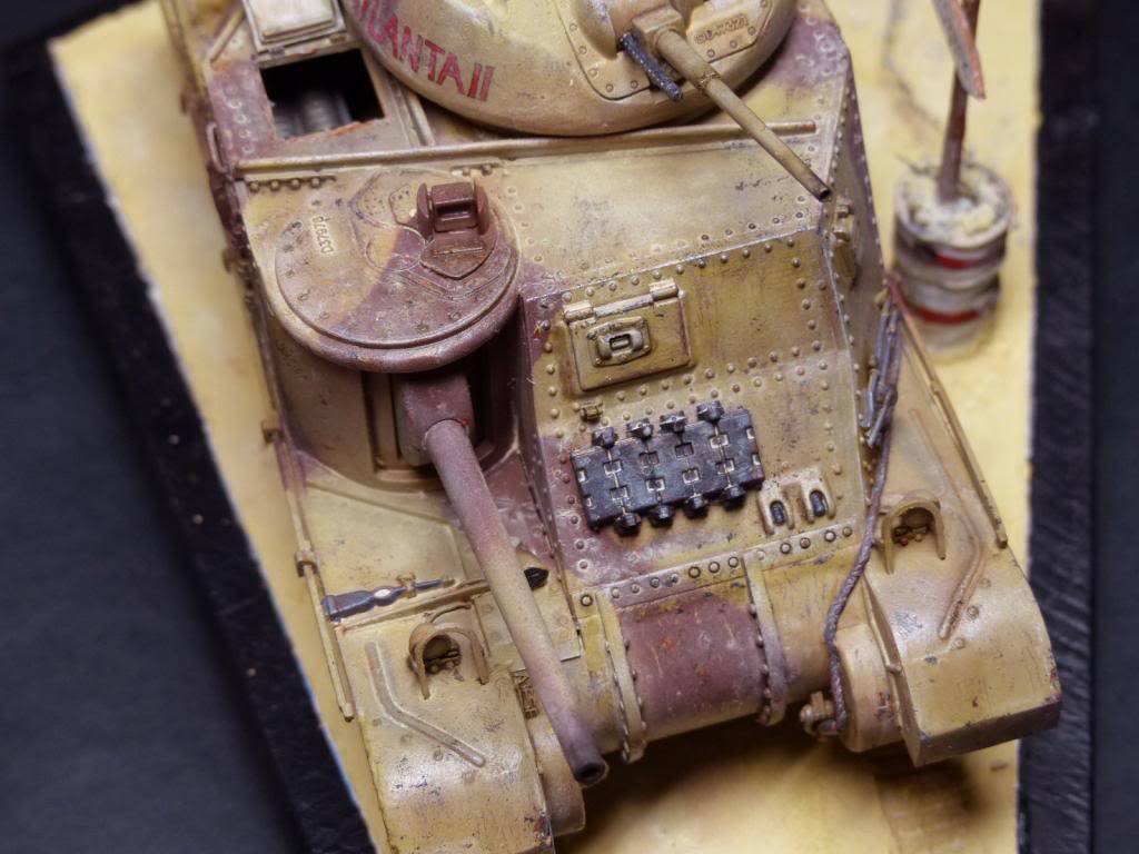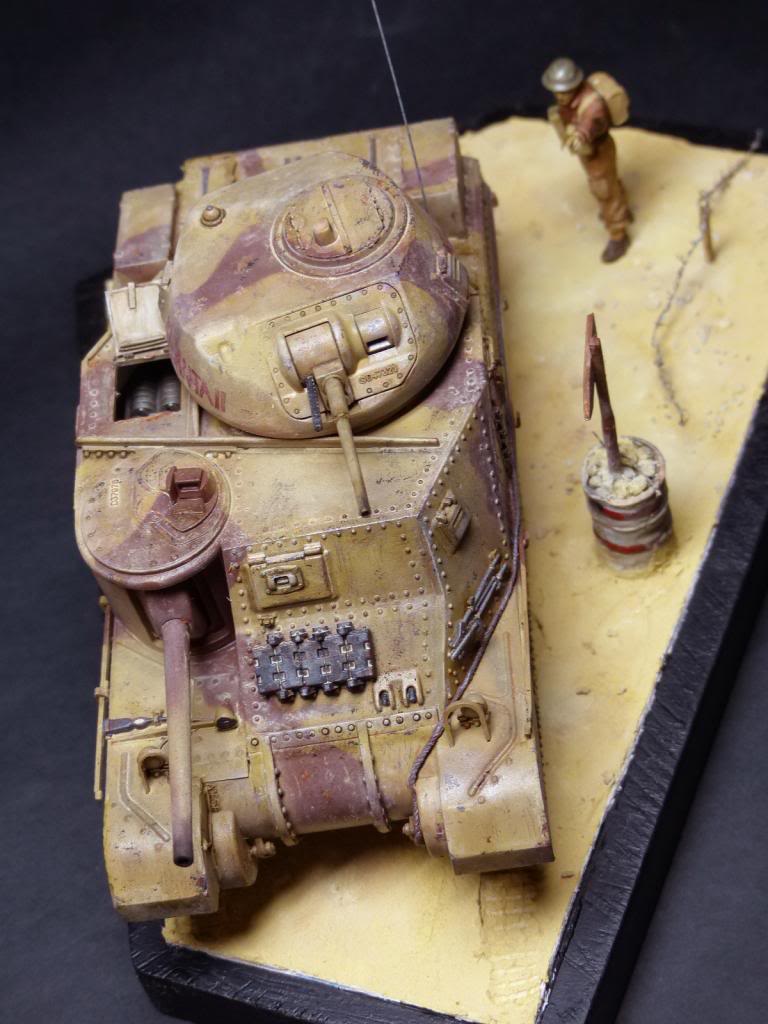 It was then time for some drybrushing, followed by a dark AK wash. To complete the job a decided to add a small base to my tank. I had a trash piece of wood: i cutted it in the deidered shape, painted and masked the borders, spreaded some Das Pronto, followed by Vallejo Desert Sand paste, and with it still fresh, i made the tracks paths, and added some small gravels. I painted an english soldier that ii had in the spare parts box, scratchbuilded some barbered wire, that i applied on the corner.