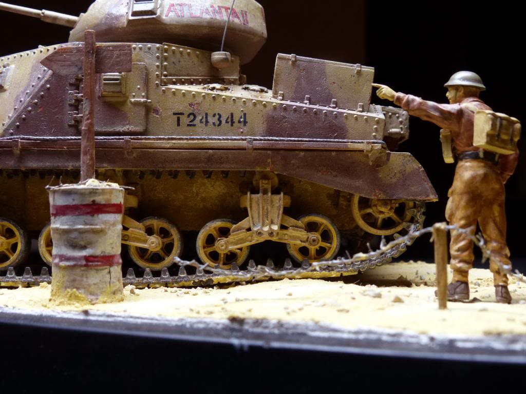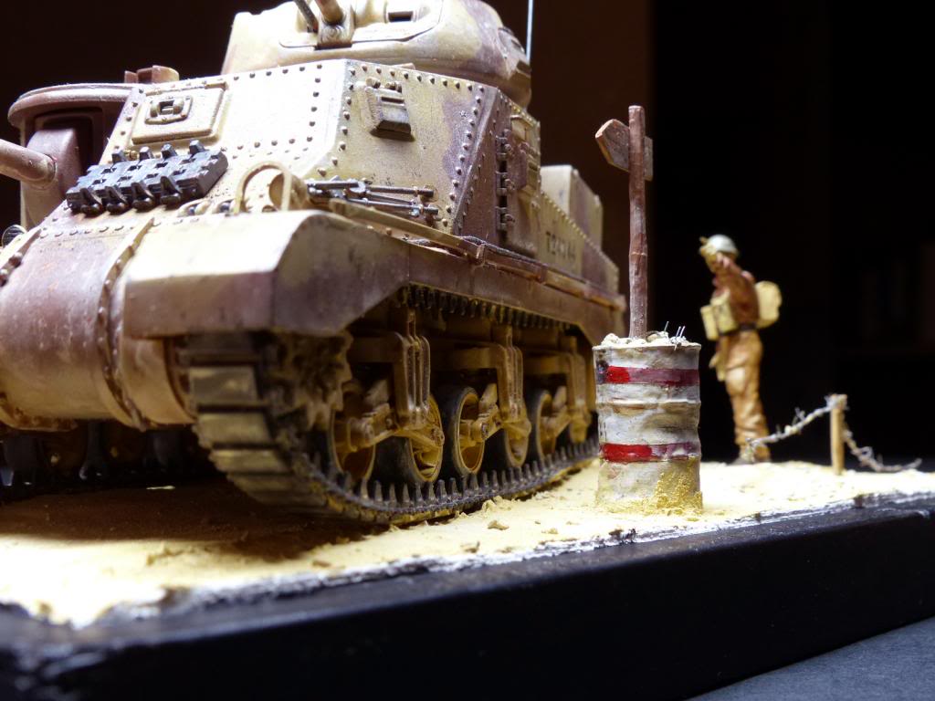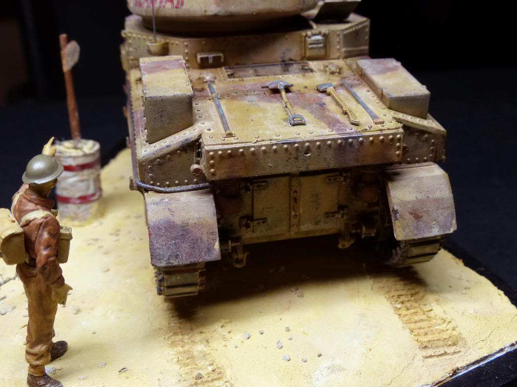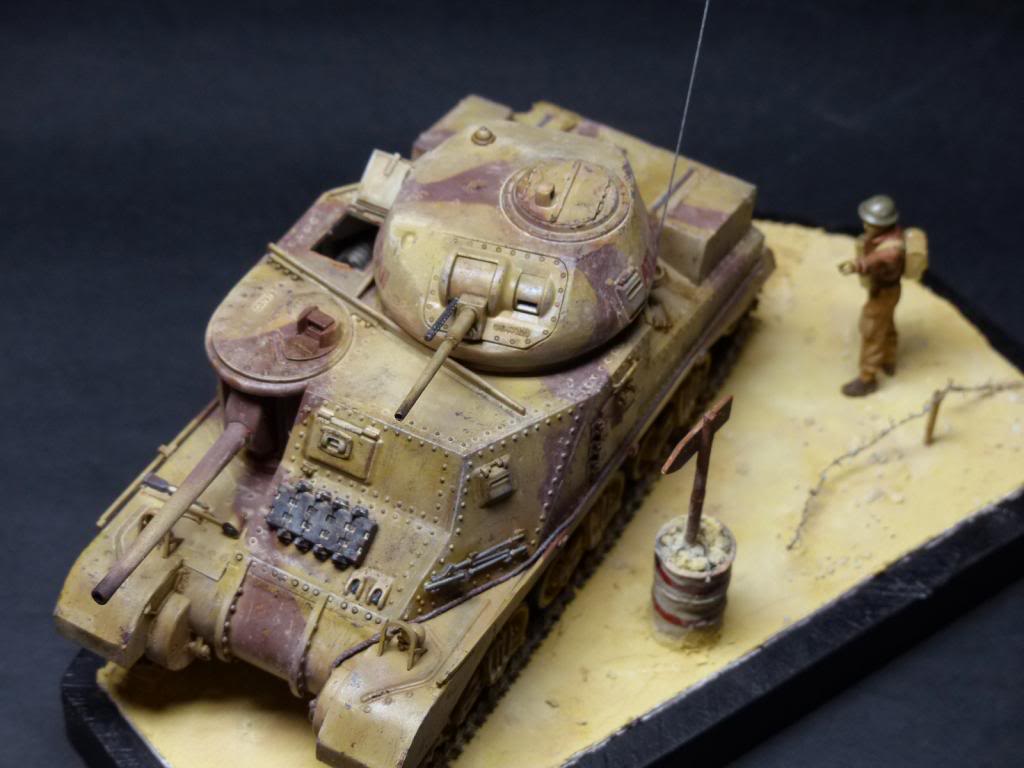 It was then time for some drybrushing, followed by a dark AK wash. To complete the job a decided to add a small base to my tank. I had a trash piece of wood: i cutted it in the deidered shape, painted and masked the borders, spreaded some Das Pronto, followed by Vallejo Desert Sand paste, and with it still fresh, i made the tracks paths, and added some small gravels. I painted an english soldier that ii had in the spare parts box, scratchbuilded some barbered wire, that i applied on the corner.