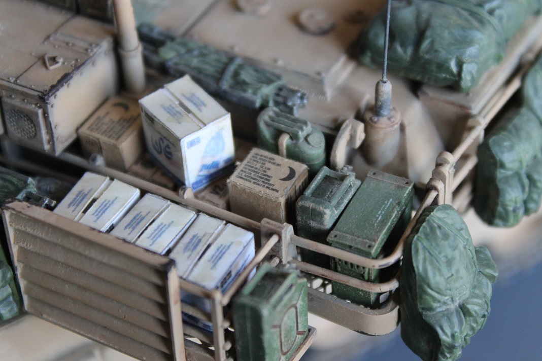 This is allmost an out-of-the-box build, I only bought a set with modern us military equpment (stowage). The cardboard boxes with food and water was found on the internet, ready to print and assemble. The techniques used for this model are: airbrush, preshade, postshade, scratching, filters, washes, pigments.